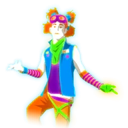 The dancer is a man with orange fluffy hair in four buns. He wears purple goggles, a blue vest with a purple sleeveless shirt, a green bandanna, orange pants with a green leg strap, purple boots with green straps, and orange and purple arm warmers. In the remake, he looks more realistic.